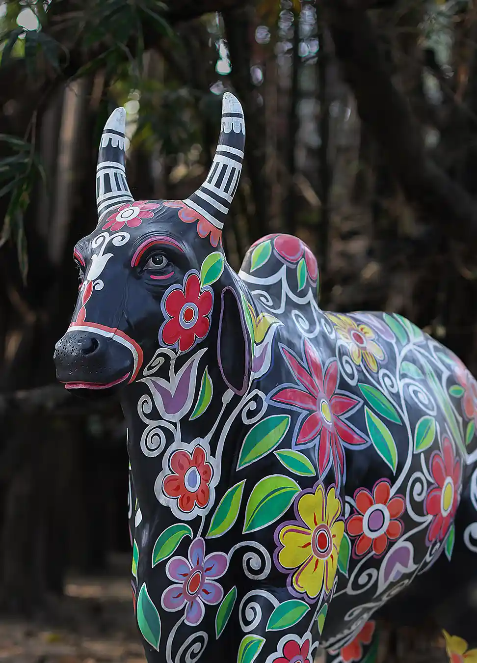 A symbol of devotion and unwavering strength, this Nandi The Bull sculpture transforms any space into a sanctuary of color, culture, and spiritual energy. Meticulously handcrafted by skilled artisans, it features vibrant, hand-painted floral motifs and expressive folk-inspired patterns that celebrate India's artistic heritage. Made from durable materials, this statement piece stands as a unique guardian of serenity and abundance.